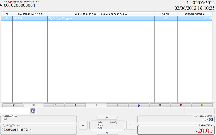ორივე შემთხვევის დასაფიქსირებლად ვიყენებთ “Enter”-კლავიშს, ჩეკის დაბრუნების ეკრანზე გამოჩენამდე. უკან დაბრუნების ჩეკი ეკრანზე გამოდის შემდეგი სახით: