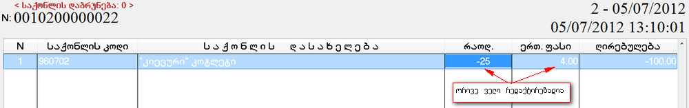 ფანჯარაში რეალიზებული საქონლის რაოდენობა მოცემული არის მინუს ნიშნით, ვინაიდან სისტემა ინფორმაციას გვაწვდის გასული საქონლის შესახებ. განვიხილოთ საქონლის დაბრუნების ვარიანტები:
