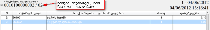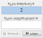 ფანჯარაში არის ორი სვეტი „ჩეკის მიმდინარე ნომერი“ და „ჩეკის ალტერნატიული ნომერი“. „ჩეკის მიმდინარე ნომერი“ სისტემა ანიჭებს მიმდინარე ნომერს ავტომატურად, „ჩეკის ალტერნატიული ნომრის“ სვეტში კი მოლარე-ოპერატორი უთითებს ჩეკის ნომერს, რომლითაც შემდეგ მოიძიებს გადადებული ჩეკების ჩამონათვალში. ალტერნატიული ნომრის მითითების შემდეგ ფანჯარაში აქტიურდება ბრძანება „შესრულება“, რომლის გამოყენებაც გულისხმობს ჩეკის გადადებას, შედეგად ეკრანზე გამოვა ახალი ფანჯარა, სადაც განთავსებული იქნება ჩეკები ძირითადი და ალტერნატიული ნომრებით. ჩეკის „გადასადებად“ ანუ დროებით შესანახად გამოიყენეთ ღილაკი „ამოირჩეიეთ ჩეკის ალტერნატული N (Enter)” ან დააჭირეთ Enter-ღილაკს, აღნიშნეული ქმედებენის შესრულების შემდეგ მოლარე-ოპერატორს შეუძლია მოემსახუროს მომდევნო მომხმარებელს.