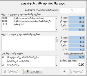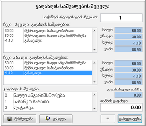 ღილაკი, მისი გამოყენებით ფანჯრის შუა ნაწილში „ჩეკი ახალი გადახდის საშუალებით“ განთავსდება განხორციელებული ცვლილება, ანალოგიურად ხდება ოპერაციის მეორე ტიპის შეცვლა. ფანჯრის შუა ნაწილში, მარჯვნივ გამოჩნდება გადახდილი თანხის რა ნაწილი დაიფარა ნაღდი ან უნაღდო ანგარიშსწორებით, დაბრუნებული ხურდა რამდენს შეადგენდა და მთლიანად გადახდილი თანხის ჯამი (გასწორებული თანხების მიხედვით).
