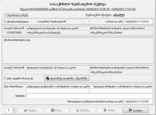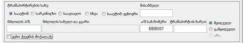 თუ ფორმაში "ტრანსპორტირების სახე" ჩავრთავთ ღილაკებს: სარკინიგზო, საავიაციო და სხვა, მაშინ შესავსები ველები გაქრება ფორმიდან, ხოლო თუ ჩავრთავთ ღილაკს "საავტომ. უცხოური", მაშინ ფორმაში შესავსები იქნება იგივე ველები, რომლებიც ივსება იმ დროს, როცა ჩართულია ღილაკი "საავტომ".