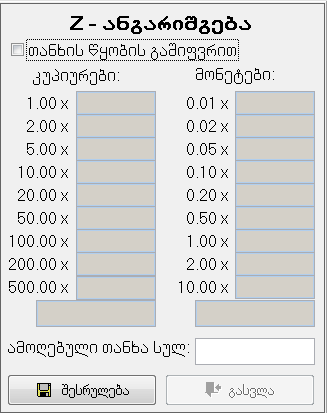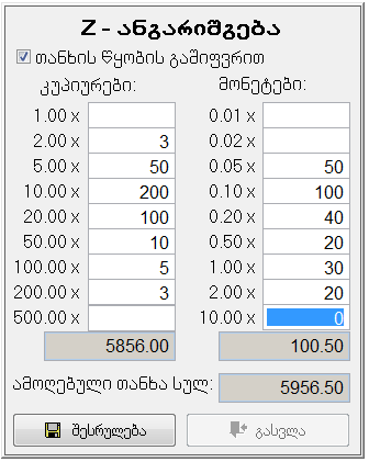 ფანჯარაში აქტიურია ველი "ამოღებული თანხა სულ", სადაც იწერება სალაროდან ამოღებული თანხა ჯამურად, თუ დადგენილია სალაროში თანხის კუპირების მიხედვით აღრიცხვა, მაშინ სალაროდან თანხის ამოღება აღირიცხება კუპიურების მიხედვით. ამისათვის უნდა ჩავრთოთ ღილაკი "თანხის წყობის გაშიფვრით", გააქტიურდება კუპიურებისა და მონეტების რაოდენობათა შესატანი ველები (თითოეულ ველში იწერება მონეტის ან კუპიურის შეტანილი რაოდენობა-ცალი) კუპიურებისა და მონეტიბის სვეტებს ბოლოში აქვს მაჯამებელი ველები, სადაც ცალ-ცალკე დაჯამდება სალაროდან ამოღებული ყველა კუპიურისა და ყველა მონეტის თანხები, შესაბამისად ორი ველის ჯამი ავტომატურად გადადის ველში "ამოღებული თანხა სულ":