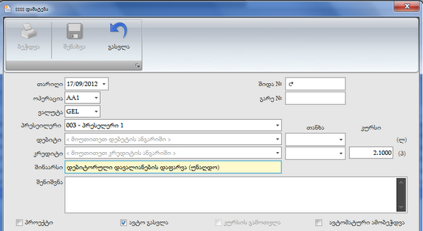 - ოპერაცია (Combo box)-ოპერაციის კოდი ავტომატურად არჩეულია;