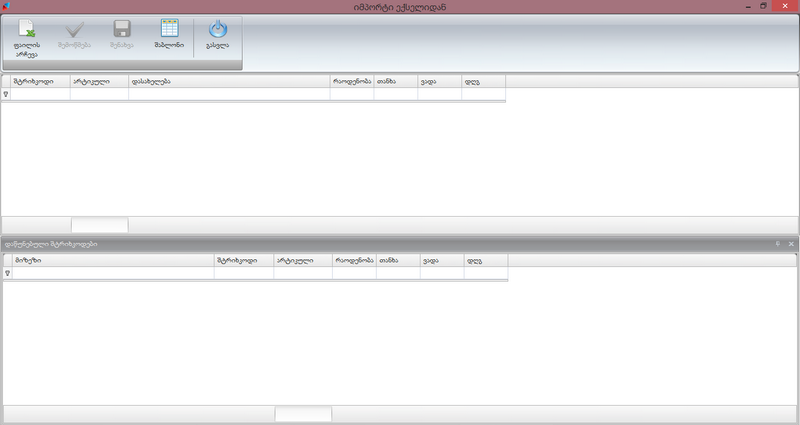 - ფაილის არჩევა-ბრძანებით ხდება Microsoft Excel-ის ფაილის მოძიება კომპიუტერში, არჩევის შედეგად ფაილში მითითებული საქონელი დაიმპორტდება ფანჯრის ზედა ნაწილში;