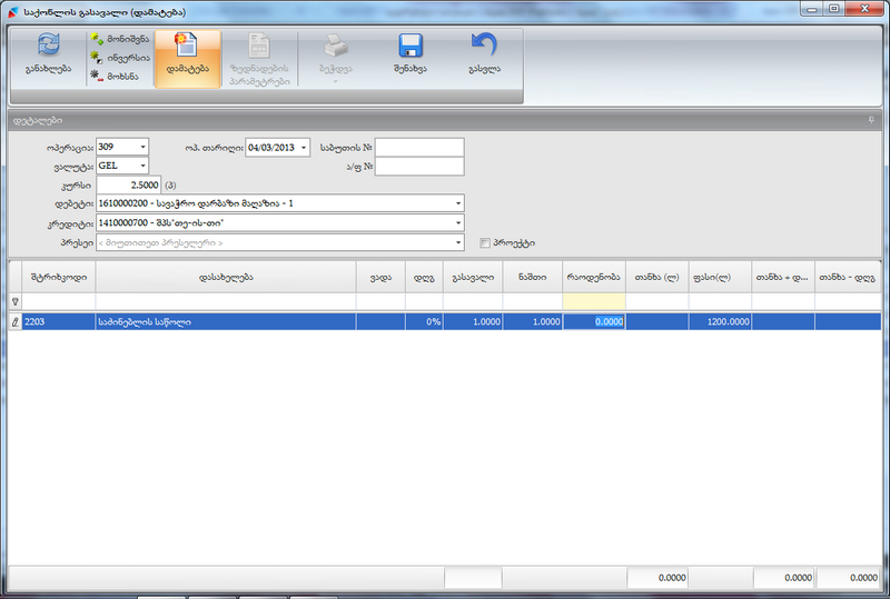 საქონლის გასავალი (დამატება)- დამატების ღილაკის საშუალებით ინფორმაცია დებიტორზე რეალიზაციის იდენტურია და რედაქტირებადი არის მხოლოდ რაოდენობის სვეტი, ცვლილების შეტანის შემდეგ, საშუალება გვაქვს საბუთის შენახვის.