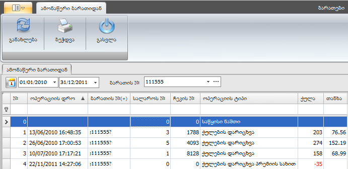 ინფორმაცია ბარათებზე არის ბარათების მოდულის ბრძანებათა ჯგუფში "ანალიზი" შემავალი ბრძანება (ბარათები => ანალიზი => ინფორმაცია ბარათებზე), რომლის დანიშნულებაა ლოიალური ბარათების მფლობელებზე ინფორმაციის მიწოდება. ბრძანების გამოყენების შედეგად, ეკრანზე გამოდის ფორმა "ინფორმაცია ბარათებზე": ![]() ფორმის მენიუს ზოლში განლაგებულია შემდეგი ბრძანებები და ღილაკები:
