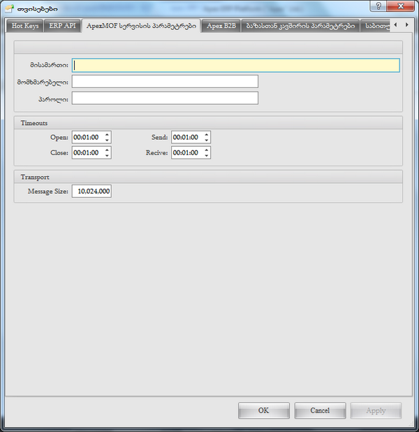 Apex MOF სერვისის პარამეტრები არის თვისებების ჩანართი, სადაც ივსება ელექტრონული ანგარიშ-ფაქტურების შემოსავლების სამსახურის ვებ-გვერდზე (www.rs.ge) ატვირთვა-ჩამოტვირთვისათვის საჭირო პარამეტრები. ჩანართზე გადასვლის შემდეგ ეკრანზე გამოდის შემდეგი ფანჯარა: