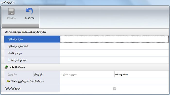 • დასახელება-ველში იწერება ბანკის (ფილიალი, სერვისცენტრი) დასახელება;