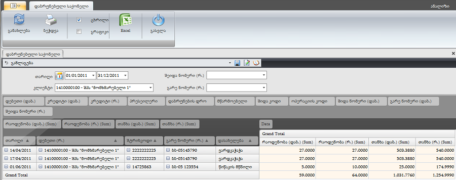 საბუთის ნახვა", მასზე დაჭერით ეკრანზე გამოდის პივოტ ცხრილში არჩეული საბუთის (დაბრუნების (დაბ.) საბუთი ან რეალიზაციის (რ.) საბუთი) შესაბამისი ოპერაციის რედაქტირების ფანჯარა: დაბრუნების ოპერაციის დროს (შიდა ნომერი (დაბ.), გარე ნომერი (დაბ.)) ეკრანზე გამოდის ფანჯარა "საქონლის შეძენა (რედაქტირება)", ხოლო რეალიზაციის ოპერაციის დროს (შიდა ნომერი (რ.) და გარე ნომერი (რ.))-"საბითუმო/საცალო რეალიზაცია (რედაქტირება)". საბუთის ნომრის შეცვლა შესაძლებელია რედაქტირების ფანჯარაშიც.