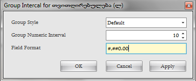 დაჯგუფებისათვის გამოიყენება ცხრილის თავზე გამომავალი კონტექსტური მენიუს ბრძანება group interval (ჩამონათვალის ღილაკი):