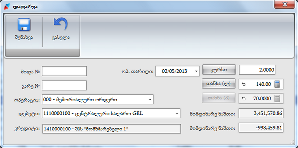 6. კრედიტი (Combo box)-ფანჯარაში ანგარიში გამოდის ავტომატურად, დასაფარი საბუთის მიხედვით და მისი შეცვლა შეუძლებელია;