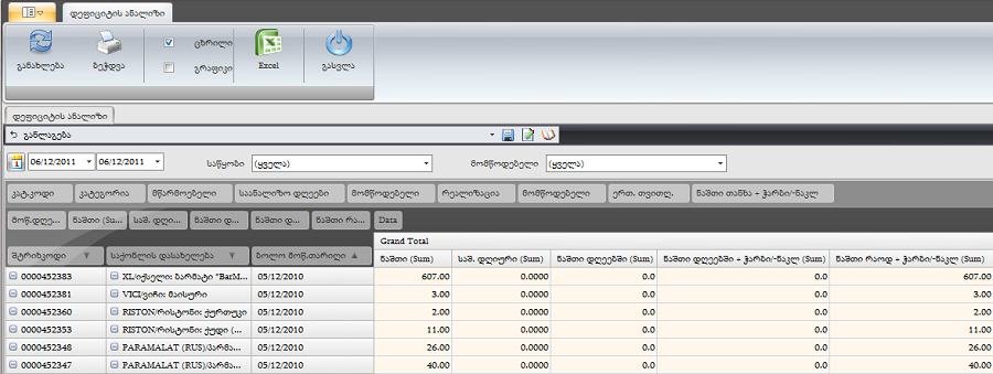 დეფიციტის ანალიზი არის მოდულის "ანალიზი" ბრძანება (ანალიზი => დეფიციტის ანალიზი), რომლის დანიშნულებაა კომპანიაში ფინანსური ანალიზით დაკავებულ მუშაკს საშუალება მისცეს წინასწარ განსაზღვროს დეფიციტური საქონელი (ნედლეული), რათა არ მოხდეს შეფერხებები წარმოებასა და რეალიზაციაში.