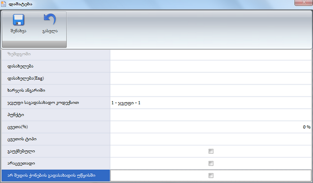 -არ შედის ქონების გადასახადის უწყისში (ღილაკი ჩამრთველი)-ღილაკი ავტომატურად ამორთულია, თუ ჩავრთავთ ღილაკს, მაშინ არსებულ აქტივი არ შევა ქონების უწყისში.