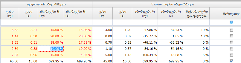 ფასების ცალკეულ სვეტში (ფასი (ლ), ფასი (პ)) ცვლილების შეტანის შედეგად ავტომატურად იცვლება მონაცემები ფასების მეორე სვეტში და ამონაგების %-ის სვეტებში. მომხმარებელს შეუძლია წინასწარ დაგეგმოს ამონაგების სიდიდე (ამონაგების %-ის სვეტში შეიტანოს სასურველი განაკვეთები) და ფასების სვეტები ავტომატურად შეივსება.