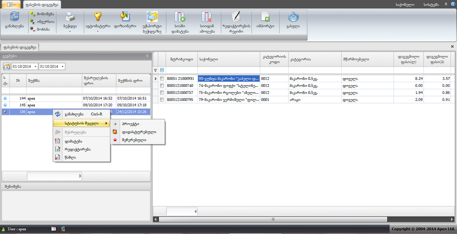 ცხრილში თავიდან ყველა დაგეგმილ ფასს აქვს სტატუსი "პროექტი", მისი შეცვლა შეიძლება კონტექსტური მენიუდან: