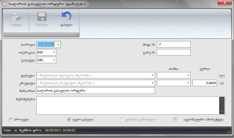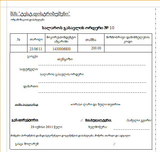 ფორმიდან იბეჭდება „სალაროს გასავლის ორდერი“: