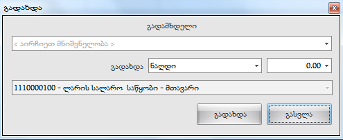 - გადახდა-გრაფაში ირჩევთ გადახდის ტიპს (ნაღდი, უნაღდო, სხვა) და უთითებთ თანხას;