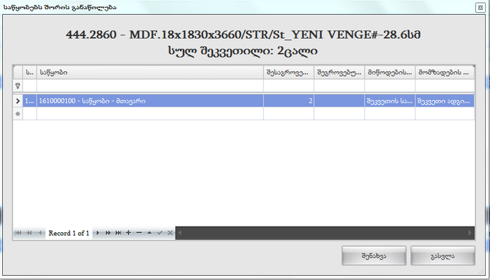 - გრაფაში უთითებთ შეკვეთის დასამზადებლად გამოსაყენებელი საქონლის (ნედლეულის) სიგრძეს (მმ), შენახვის ბრძანების გამოყენებით მოხდება დაჭრილი საქონლის (ნედლეულის) რეგისტრაცია, სისტემა მიღებულ საქონელს (ნედლეულს) შტრიხკოდს ანიჭებს ავტომატურად, პირვანდელი შტრიხკოდი და ნაჭრის სიგრძე იმიჯნება წერტილით, შედეგად საქონელი ავტომატურად განთავსდება ცნობარების მოდულში (ცნობარები=>საქონელი=>რეგისტრირებული).