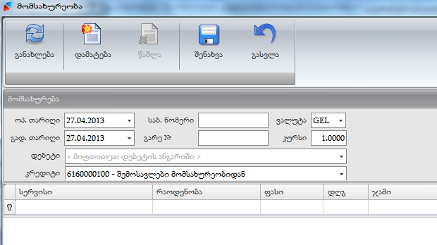 ვირჩევთ მომსახურების სახეს, მასზე მაუსის მარცხენა ღილაკზე ორჯერ დაჭერის (Enter) შდეგად მოხდება მომსახურების დამატება. მომსახურების დამატების შემდეგ, მივუთითებთ მომსახურეობის ერთეულის რაოდენობას, რის შემდეგაც ავტომატურად ჩაიწერება მომსახურეობის მთლიანი თანხა და დღგ-ს თანხა. მაგალითად: სერვისებში დამატებული გვაქვს მომსახურების სახე - ფანჯრების წმენდა, რომლის ერთეულის ფასია 100 ლ, როდესაც მომსახურეობის ფორმაში ავირჩევთ და ჩავწერთ ფანჯრების რაოდენობას, პროგრამა გადაიანგარიშებს მომსახურეობის მთლიან თნხას და დღგ-ს თანხას.