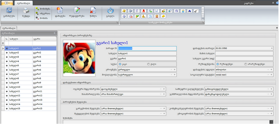 ფორმას "პერსონალი" აქვს მენიუს ზოლი, სადაც განთავსებულია საანკეტო მონაცემები და ბრძანებები: