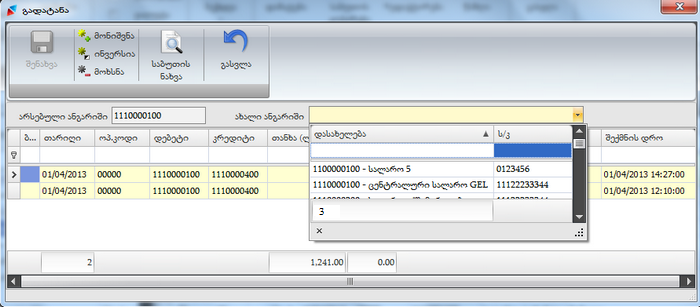 • მოკორესპოდენტო-მისი გამოყენებით ავტომატურად გადავდივართ მოკორესპოდენტო ანგარიშზე და განახლების შემდეგ ფორმაში გამოჩნდება ამ ანგარიშის ბრუნვები;