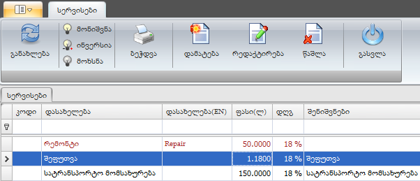 სერვისები არის ცნობარების მენიუს ბრძანება, რომელიც შედის ჯგუფში „სხვა“ (ცნობარები => სერვისები). ჯგუფის ბრძანების გამოყენების შემდეგ ეკრანზე გამოდის ფორმა "სერვისები". მისი დანიშნულებაა "სერვისების" ცნობარის სახით შექმნა, რომელიც გამოიყენება მომსახურების ოპერაციის დროს. მომსახურება ეს არის ნებისმიერი სახის საქმიანობა, ან სარგებელი, რომელსაც ერთი მხარე სთავაზობს მეორეს. მომსახურება თავისი არსით არანივთობრივი, არათვალსაჩინოა, რაც გულისხმობს იმას, რომ შეუძლებელია მისი დანახვა, მოსმენა, ხელით შეხება და იგი არ გულისხმობს მფლობელობასა და საკუთრების გადაცემას. განახლების ბრძანებით ეკრანზე გამოვა სისტემაში არსებული "სერვისების" ჩამონათვალი, რომელიც ცხრილის სახით არის წარმოდგენილი.