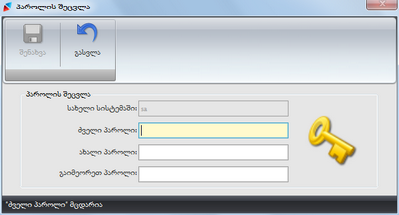პაროლის შეცვლა არის სისტემური მენიუს ბრძანება. პაროლის შესაცვლელად დაიცავით მოქმედებათა თანმიმდევრობა: სისტემური მენიუ => პაროლის შეცვლა: ![]() აღნიშნული ბრძანების გამოყენებით ეკრანზე გამოვა შესაბამისი დასახელების ფანჯარა: ![]() ფანჯარას აქვს შემდეგი სვეტები:
