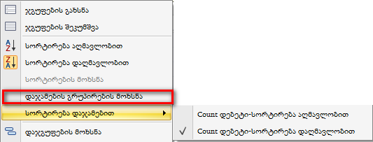 სორტირება დაჯამებით“ ოპერაციების გაუქმება შესაძლებელია სვეტის სათაურზე გამომავალი კონტექსტური მენიუს ბრძანებით „