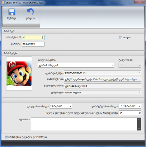- ახალი (ღილაკი ჩამრთველი)-ღილაკი ავტომატურად ჩართულია ფანჯრის ეკრანზე გამოსვლისას და საშუალებას გვაძლევს შევქმნათ ახალი ბრძანება. როდესაც ერთ დღეს რამდენიმე თანამშრომლის დაბრუნება ხდება ბიულეტენიდან და გვინდა ამ პროცესის შესრულება ერთი ბრძანებით, ამისათვის საკმარისია ერთი თანამშრომლისათვის შევქმნათ ბრძანება. შემდეგ ყოველი ახალი თანამშრომლის ბიულეტენიდან დაბრუნებისას გამოვრთავთ ღილაკს "ახალი", ფანჯარაში ბრძანების ნომრის გვერდით გაჩნდება კიდევ ერთი ველი (Combo Box), საიდანაც ავირჩევთ იმ ბრძანების ნომერს, რომლითაც პირველი თანამშრომელი დავაბრუნეთ ბიულეტენიდან. ბრძანების ნომრის ველში ავტომატურად ჩაიწერება ჩვენს მიერ არჩეული ბრძანების ნომერი, ხოლო თარიღის ველში (რომლიც აღარაა აქტიური)-ბრძანების შესაბამისი თარიღი. შემდეგ ვაგრძელებთ ისე, როგორც ზემოთაა აღწერილი.