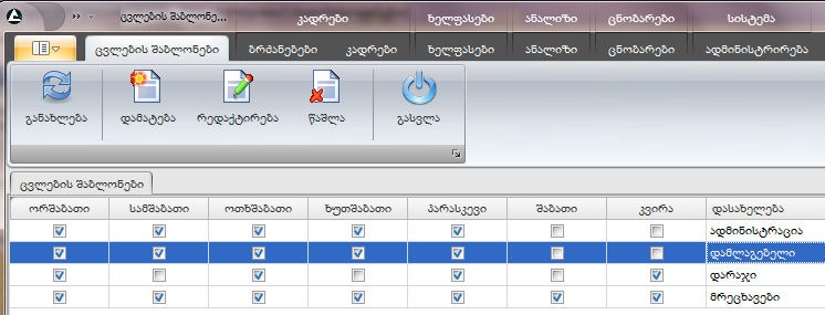 -სამუშაო დღეები-ჩამოთვლილია კვირის დღეები, რომელთაც აქვთ ღილაკი ჩამრთველები. რომელ დღეებსაც ჩავრთავთ ის დღეები დაიგეგმება სამუშაო დღეებად კონკრეტული ჯგუფის პერსონალისათვის (ტაბელის აღრიცხვა => ჩანართი "დაგეგმვა");