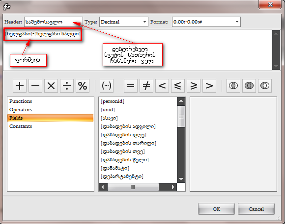 Grid-ში და Pivote table-ში მომხმარებელს შეუძლია გამოიყენოს ფორმულები და ფუნქციები, მათი გამოყენაბა შესაძლებელია დუბლირებულ სვეტებში. დუბლირებული სვეტების სათაურზე გამომავალ კონტექსტურ მენიუს ბრძანებათა ჩამონათვალში ემატება ბრძანება: "f= ფორმულის რედაქტირება". ბრძანებაზე დაწკაპებით გამოდის ფანჯარა საიდანაც შესაძლებელია, როგორც ფორმულების ისე ფუნქციების გამოყენებით დუბლირებულ სვეტში მნიშვნელობების შეცვლა. ვთქვათ გვაქვს ორი სვეტი: "ხელფასი" და "ხელფასი ნაღდი". თუ გვინდა რომ დუბლირებულ სვეტში ჩავწეროთ საშემოსავლოს თანხა, მაშინ "Expression editor" ფანჯარაში ფორმილის ჩასაწერ ზოლში ჩავწერთ შესაბამის ფორმულას. ამისათვის ვირჩევთ "fields", შემდეგ სვეტების ჩამონათვალიდან "ხელფასი" და მასზე ორჯერ დაწკაპებით იგი ავტომატურად ჩაიწერება ფორმულის ზოლში, დავსვავთ "-" ნიშანს ხელით ან ინსტრუმენტებიდან და შემდეგ ავირჩევთ სვეტს "ხელფასის ნაღდი". ფორმულის ჩასაწერ ზოლში ჩაიწერება შესაბამისი ფორმულა, რომლის დადასტურების შემდეგ (OK) დუბლირებულ სვეტში ჩაიწერება დაკავებული სასემოსავლო გადასახადის თანხა.