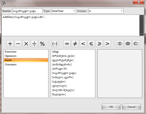 ფუნქციების ჩასაწერად ფირჩევთ "Functions", ხოლო ფუნქციათა ჩამონათვალიდან ვირჩევთ იმ ფუნქციას, რომელიც შეესაბამება დუბლირებული სვეტის ფორმატს და ჩვენს მოთხოვნას ერთდროულად. ვთქვათ გვაქვს ცხრილი, რომლის ერთ-ერთ სვეტში მოცემულია დავალიანების გადახდის თარიღები და გვინდა რომ დუბლირებულ სვეტში კონტრაქტის მოქმედების თარიღები გადავწიოთ 50 დღით (იგულისხმება, რომ დუბლირებულია თარიღის სვეტი, რადგან შეცვლილი მონაცემები ისევ თარიღის ფორმატში გვჭირდება). ამისათვის ორჯერ ვაწკაპებთ ფუნქციას "AddDays(,)", იგი ავტომატურად ჩაიწერება ფუნქციებსა და ფორმულების ჩასაწერ ველში, ფუნქციის პირველ არგუმენტად ვირჩევთ სვეტს "საგამოცდო ვადა" (fields-გადახდის თარიღი), ხოლო მეორე არგუმენტად ხელით ჩავწერთ 60-ს. დადასტურების შემდეგ (OK) დუბლირებულ სვეტში ჩაიწერება 60 დღით გადაწეული თარიღები.