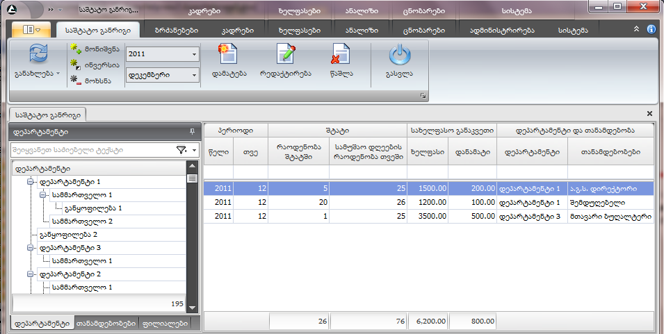 კადრების ბრძანებათა ჯგუფ საშტატო განრიგში შემაავალი ბრძანება (HR => კადრები => კადრები => ტაბელის აღრიცხვა). ბრძანების დანიშნულებაა კომპანიის თანამშრომლებისათვის სამუშაო დღეების დაგეგმვა და აღრიცხვა. ბრძანებაზე დაწკაპების შემდეგ ეკრანზე გამოდის ფორმა "სამუშაო დღეების დაგეგმვა & აღრიცხვა":![]() ფორმასთან ერთად ეკრანზე გამოდის ჩანართი "დეპარტამენტი", რომელიც შედგება ორი ნაწილისაგან: ზედა ნაწილში მოცემულია კომპანიის ქვედანაყოფების სტრუქტურა, ხოლო ქვედა ნაწილში კალენდარი სამუშაო დღეების დასაგეგმად. საკუთრივ ფორმას აქვს ორი ჩანართი: დაგეგმვა და აღრიცხვა.