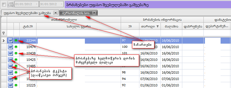 - ჩამონათვალიდან ავტომატურად ჩართულია ღილაკი "უფასო შვებულებები". ღილაკის "პერსონალის სია" ჩართვა იწვევს მენიუს ზოლში ცვლილებებს: ბრძანების "ხელმოწერა" ადგილზე ჩნდება ბრძანება "ფილტრი". ჩამონათვალში ღილაკების ჩართვით შეასაძლებელია ახალი ბრძანების შექმნა, შესაბამისი დასახელების ჩანართები განლაგდება ცხრილის თავზე თარიღის შუალედის ქვემოთ, ხოლო ეკრანზე გამოდის Microsoft Word-ის ფაილებად ფორმირებული შესაბამისი ბრძანებები აუტენტიფიკაციის დონის ჩვენებით. Microsoft Word-ის ფაილზე ორჯერ დაწკაპებით ეკრანზე გამოდის ბრძანების ტექსტი, ხოლო სტრიქონის სხვა ნებისმიერ ადგილზე დაწკაპებით-ბრძანების რედაქტირების ფანჯარა: