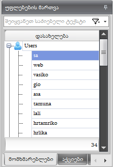 როცა ჩანართში აქტიურია მომხმარებლები (Users), მაშინ იგივე ჩანართები (ერთი განსხვავებით-"მომხმარებლების" ნაცვლად იქნება "როლები") მოსჩანს ძირითად ფორმაშიც.