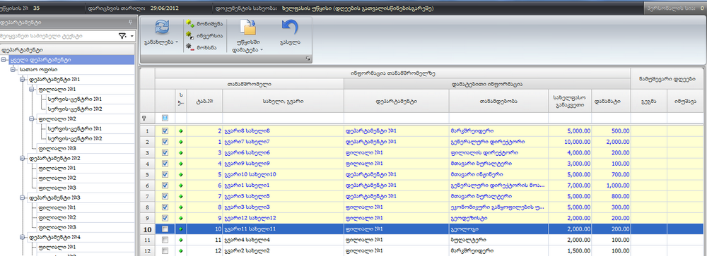 - დეპარტამენტი-გვიჩვენებს დეპარტამენტების ჩამონათვალს, კონკრეტულ დეპარტამენტზე ან მის ქვედანაყოფზე დადგომისას ფორმაში გამოჩნდება ამ დეპარტამენტის ან ქვედანაყოფის პერსონალის სია. ჩანართებში გამოდის კონტექსტური მენიუ, რომელსაც აქვს ორი ბრძანება: გაშლა, შეკუმშვა;